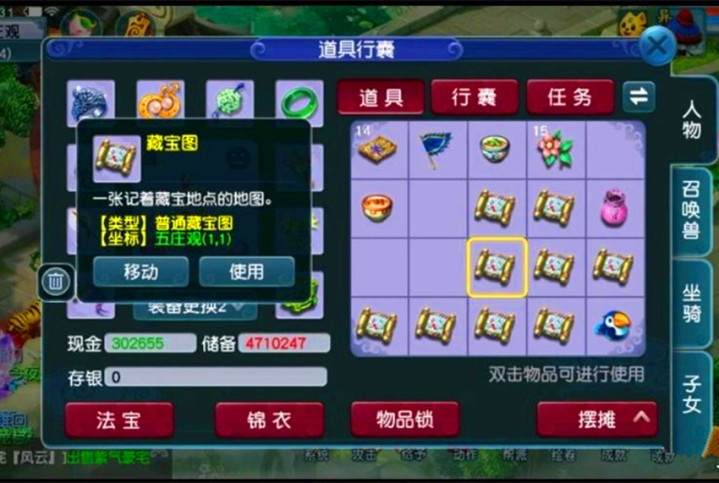 上面是一位挖低级藏宝图的玩家,上面这位玩家使用的这张藏宝图的坐标点是有点问题的,坐标点是五庄观的(1,1),这个坐标是很难走过去的,上面这位玩家自己走过去的时候总是被传送到大唐境外。碰到上面这种情况的时候,小编的建议是没有必要得到精准坐标,在坐标范围内在坐标两三个误差内都是可以使用藏宝图的,如果真的想到精准坐标的话,那就在地图上选择在地图上能够选中,那么就肯定能够走得过去。
